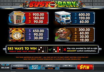 Bust The Bank – игровой аппарат, в котором геймеры станут свидетелями погони полицейских за грабителями банка. Эмулятор пропитан риском, опасностью и драйвом, что удачно подчеркивают его символы: воришки с мешками, полными монет и баксов, коп с дубинкой и девушка-полицейская на машине, инкассаторская машина, бульдог, банк и взрывчатка.