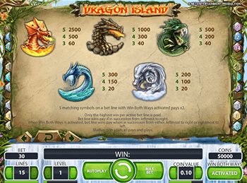Символы в автомате Dragon Island сделаны очень здорово. Тут появляются каменные знаки в виде карточных номиналов, а также пять различных драконов. Сразу два Вайлда помогут с зарабатыванием денег. Первым из них является каменная статуя в виде дракона. Этот Вайлд способен заменить все другие картинки. Если же геймеры активируют функцию Win Both Ways, можно рассчитывать на помощь другого Дикого символа, на котором изображена статуя золотого дракона. Этот символ не только заменит другие изображения, но и умножит выплату на случайный коэффициент от 2 до 8.