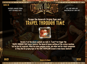 Официальный сайт представляет слот-машину His Curious Machine, которая покажет на что способна за счет особых символов – Вайлда, Скаттера и Бонуса. Ими стали символ воронки, которая засасывает и переносит во времени, динозавр, который станет признаком того, что для машины нет временных рамок и пульт управления. Вайлд заменит другие символы, а также «претасует» те, которые будут по близости, ведь они попадут в воронку. Скттеры стартуют порцию фриспинов с множителями выплат от одного до пяти.