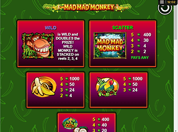 Игровой автомат Mad Mad Monkey с первых спинов вовлекает в виртуальное сумасшествие. Помогают ему особые символы, которые делают гэмблинг ярче – Вайлд и Скаттер. Их роли разработчики присудили самой обезумевшей мартышке и логотипу игры. Мартышка заменит недостающие символы и удвоит выплаты за призовые сочетания, если примет в них участие. Впечатлит то, что на центральных барабанах Вайлд становится растянутым на весь барабан. Скаттеры стартуют десять фриспинов с утроенными выплатами, а это настоящее азартное безумие!