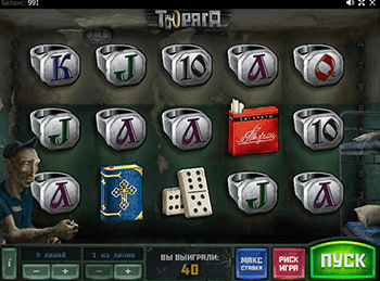 Тюряга – это один из лучших игровых аппаратов от компании Unicum. Благодаря наличию демо симулятора геймерам удается разобраться в методике формирования призовых комбинаций без осуществления ставок на деньги. Для составления выигрышных сочетаний используются игральные кости с нанесенными на них изображениями букв, цифр, пачек сигарет, библий, кружек чифиря, а также главных героев вышеуказанной слот-машины – зеков. При совпадении трех и более символов подряд на одной из линий игрок получает на свой счет призовые денежные средства.